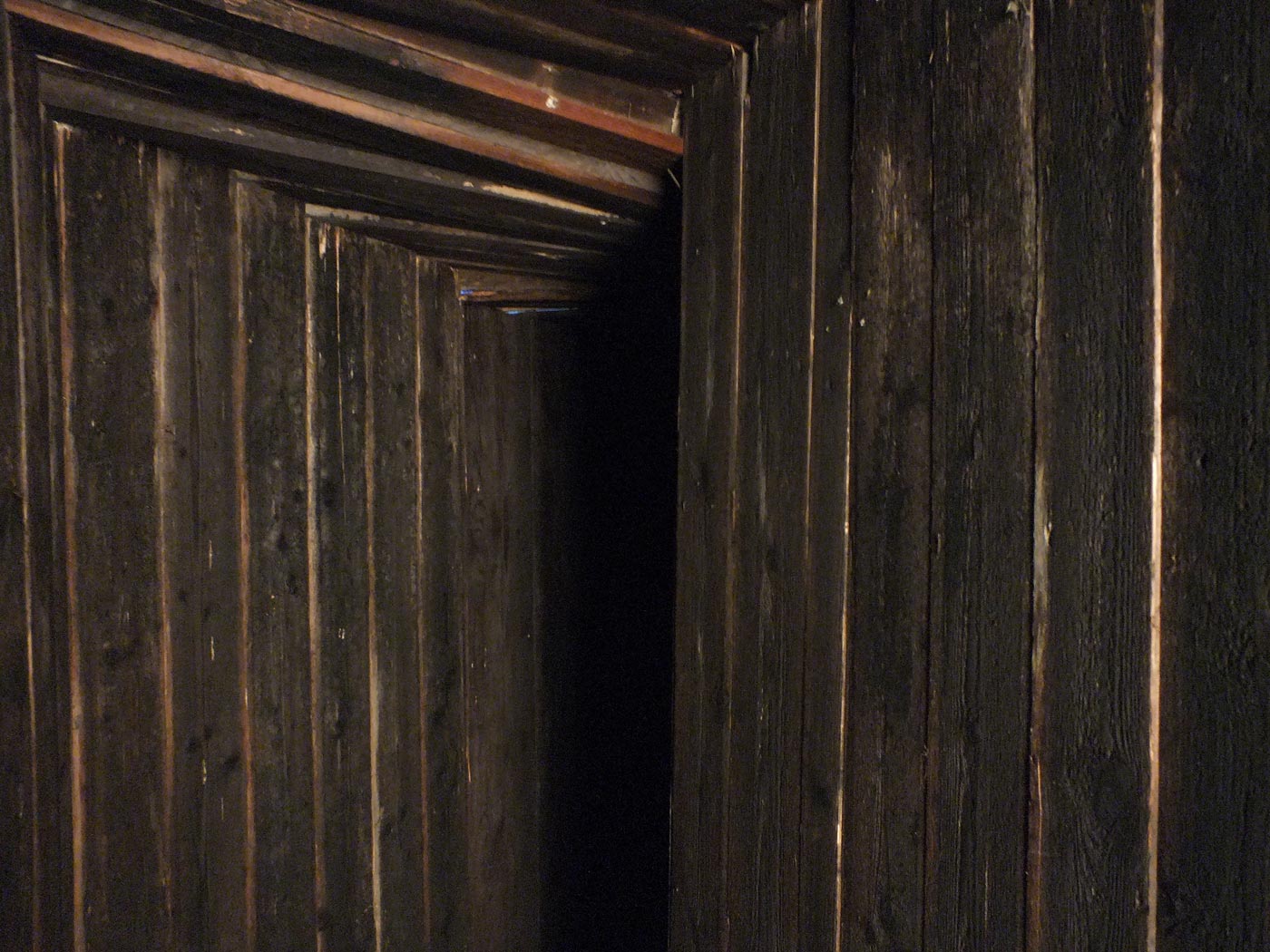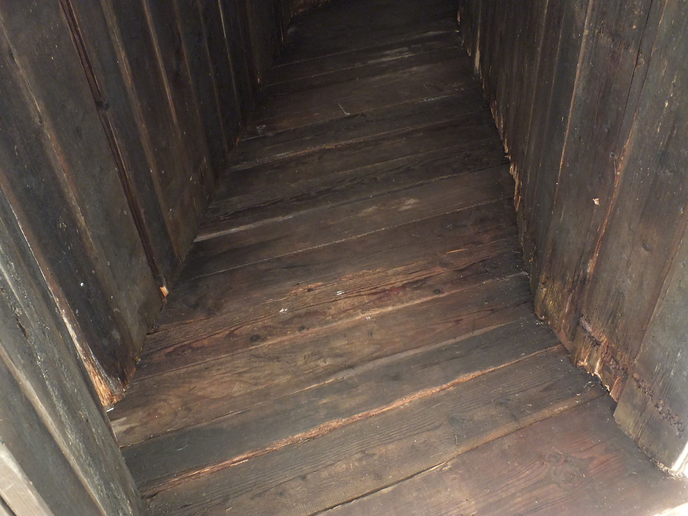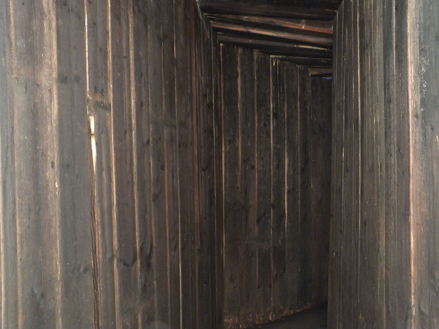 Der Senatssaal, als studentischer Ausstellungsort der HfBK Dresden, wird bestimmt von einer großen Fensterfront, dem Parkettfußboden und einer hohen, vergoldeten Stuckdecke mit Glaskuppel. In diesen Raum bauten wir einen fünf Meter tiefen Gang aus altem Holz. Im Inneren war es stockfinster und das Ende des Gangs war von der Tür aus nicht einsehbar. Wir haben das Holz täglich mit bis zu 20 Liter Wasser feucht gehalten, so dass sich ein unterschwelliger, modriger Geruch verbreitet hat. Die Klimageräte erzeugten einen kühlen Luftzug.