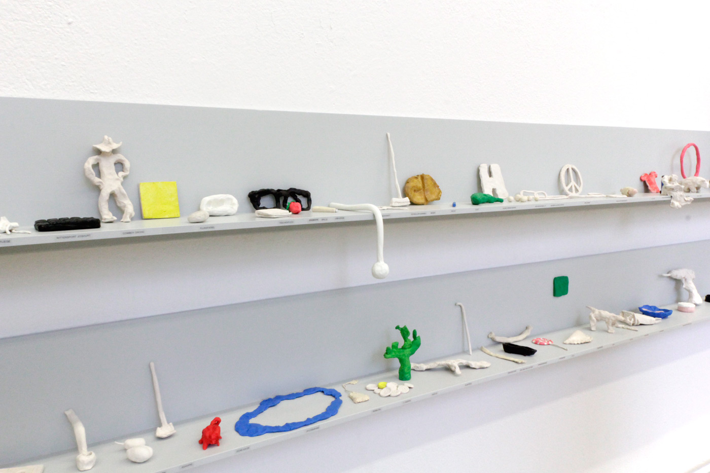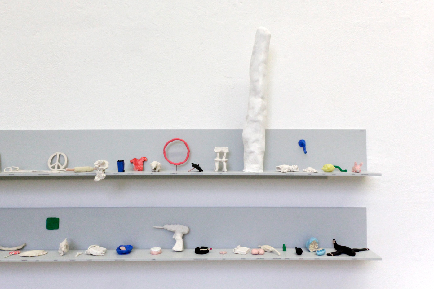 Die Arbeit besteht aus ca. 100 modellierten Objekten. Ich habe jeweils einem Begriff eine Form gegeben, frei assoziiert und so schnell wie möglich. Das war mir wichtig, um das modellierte Ergebnis unmittelbar zu sehen. Wie sieht Müdigkeit aus?